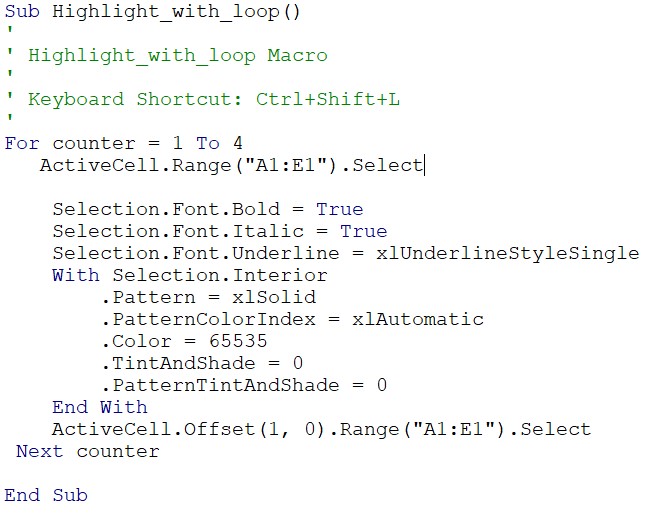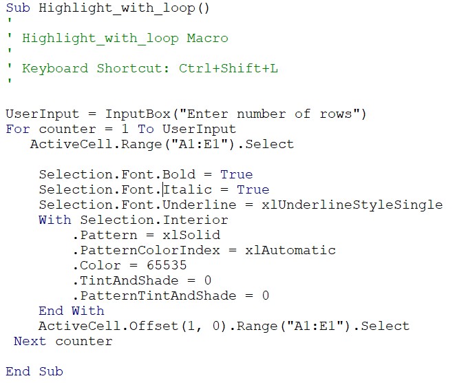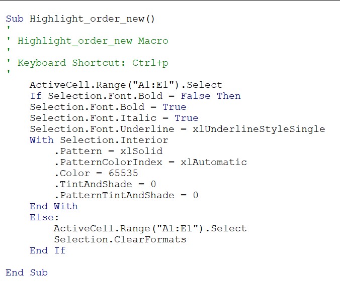 Using this macro toggle, If the selected cell doesn’t have any formatting then it’ll add the formatting mentioned in the first if part. If there’s formatting then in that case it’ll execute the else part and all the formatting will be cleared out.
